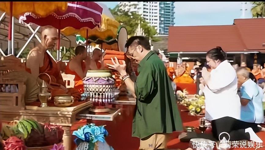 从网友上传的视频里可以看见,吴镇宇穿着一件绿色的休闲衬衫,搭配咖色裤子,赤脚跪在佛塔前,手上戴的佛珠特别引人注意。那低头虔诚的模样,真让人联想到他曾饰演的那个角色猜叔。
